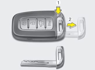 1. Depress and hold the release button (1) and remove the mechanical key (2).